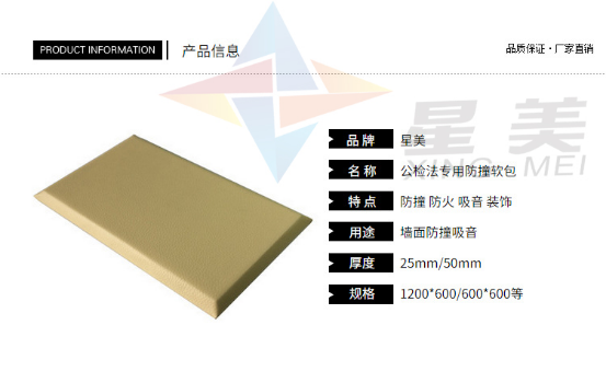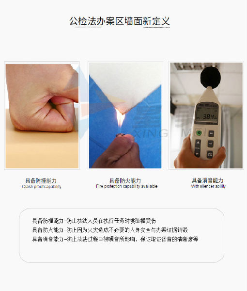星美防撞墻具有阻燃,吸音,隔音,防潮,防霉,防水,防油,防塵,防污,防靜電,防撞的功能。不易劃破,防撞率達99%,是派出所,拘留所,辦案區(qū)等場所裝修常用的防撞防火環(huán)保材料。