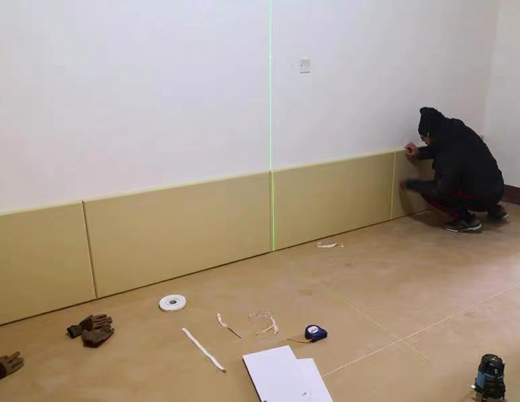 7、防撞門的安裝:將軟包裁剪成跟門相對應尺寸,組裝門邊線,將門邊線裁剪好相應尺寸,將軟包粘貼到門上面,用配套的門邊線收邊,在門的正反兩面安裝一個軟質(zhì)門拉手。
