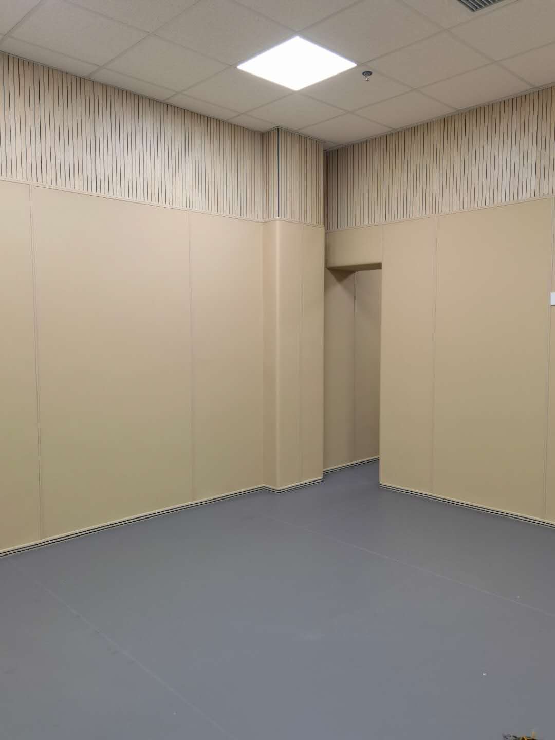 先做地面和吊頂,地面可用塑膠地板,吊頂可參考用玻纖天花板(A級防火,吸音材料);墻面可使用平整光潔可粘木工阻燃板(一般可用9mm)作為底板,一般室內的墻有灰塵或者不夠平整,我們建議是打一層木工底板,中纖板,普通版都可以,當?shù)亟ú氖袌鼍涂梢越鉀Q。